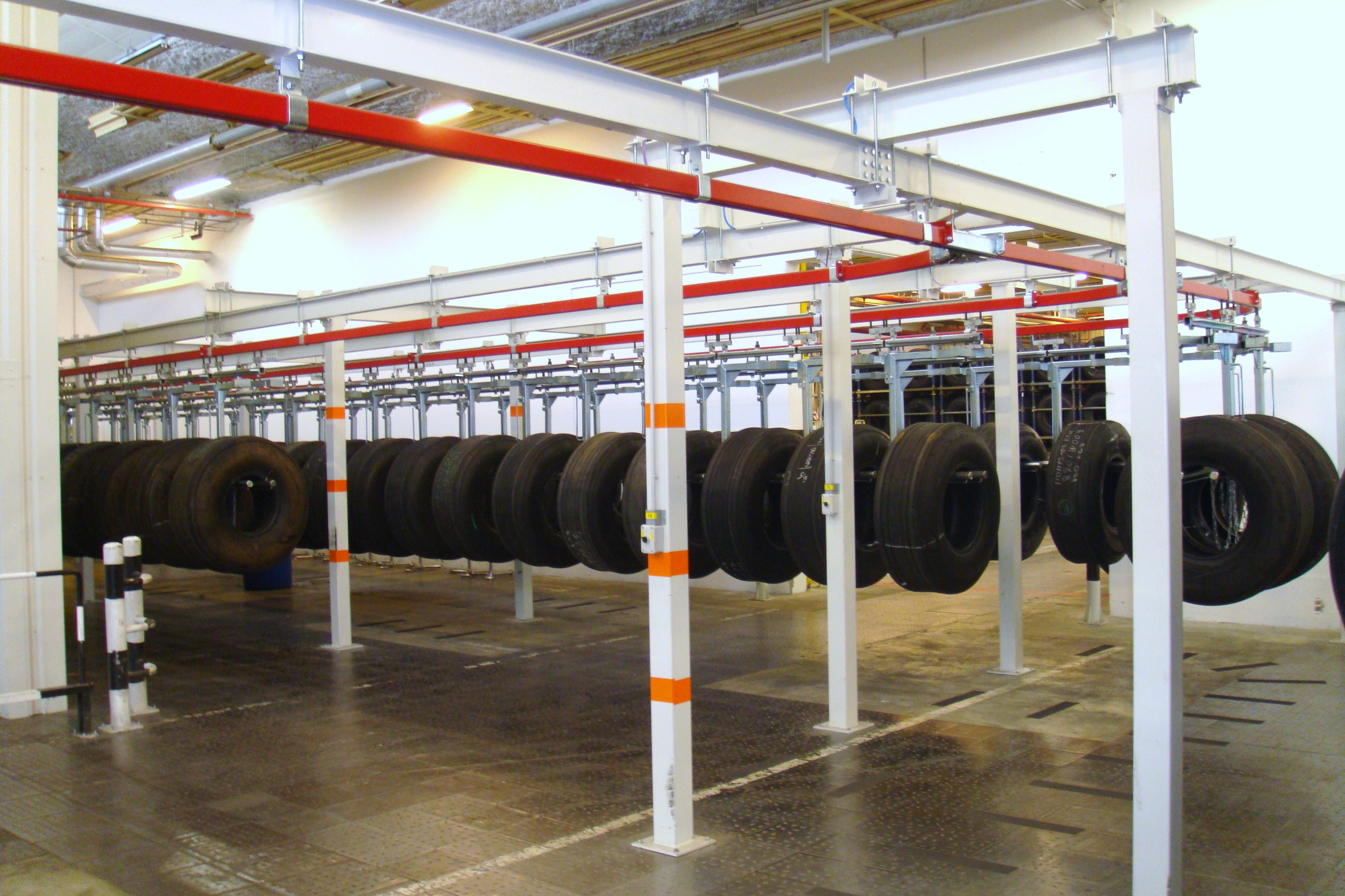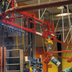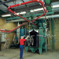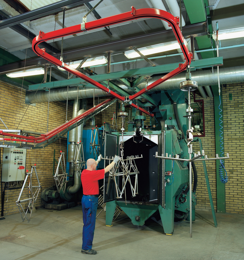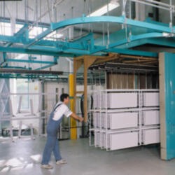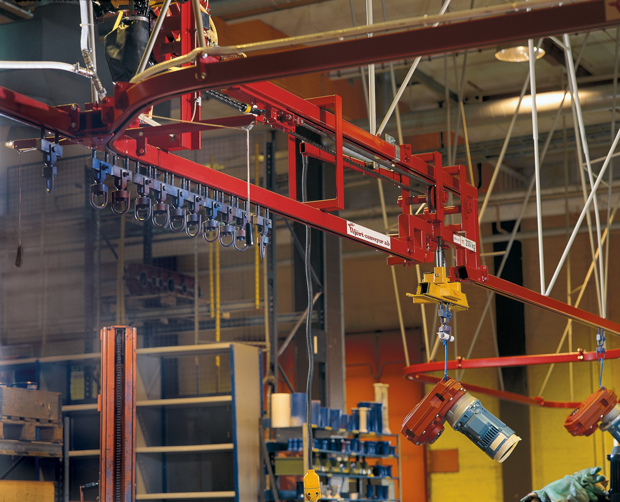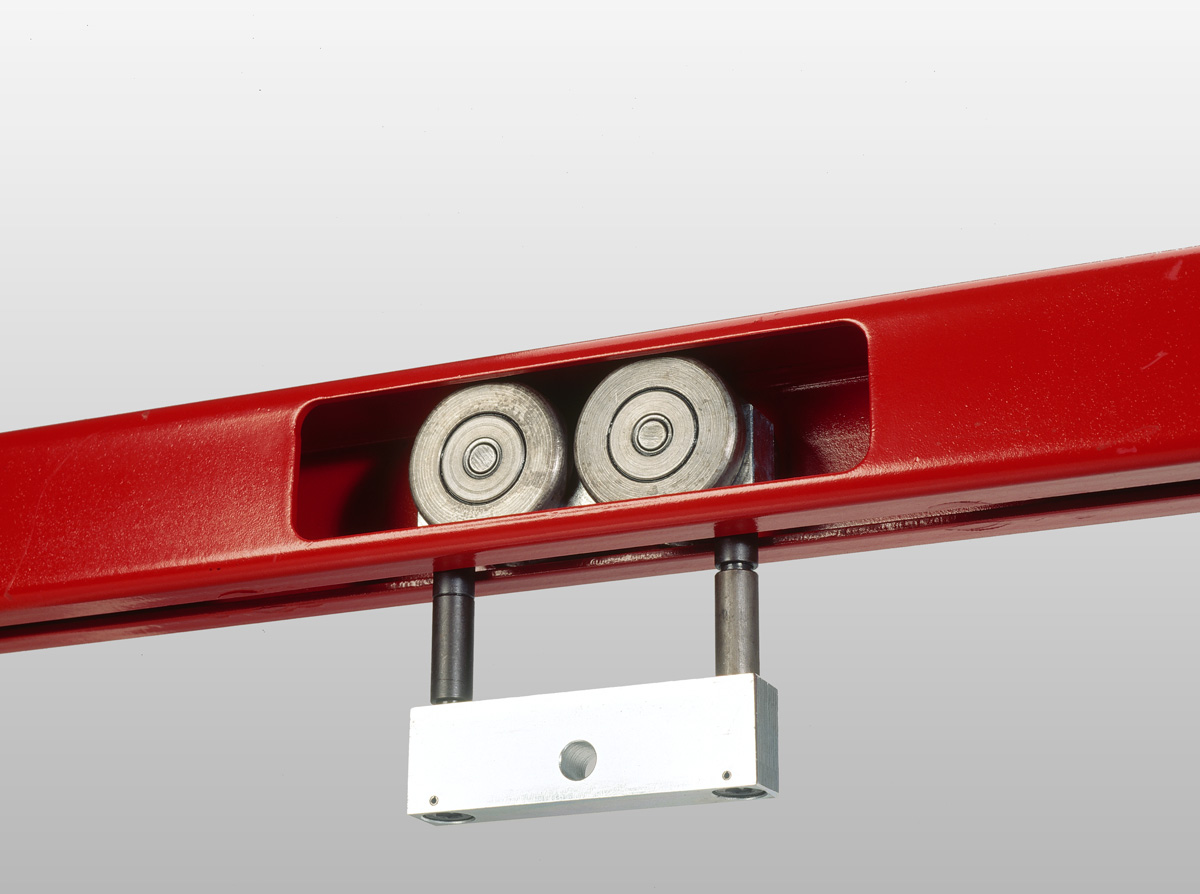 The 500 Series suspension track is for loads up to 500 kg. The loads are forwarded manually or roll under their own weight on sloping tracks. Where there are differences in level or long transport distances, the system can be fitted with drive motors. The system includes switches, turntables and drop-sections.