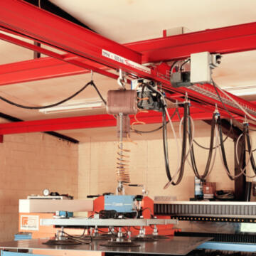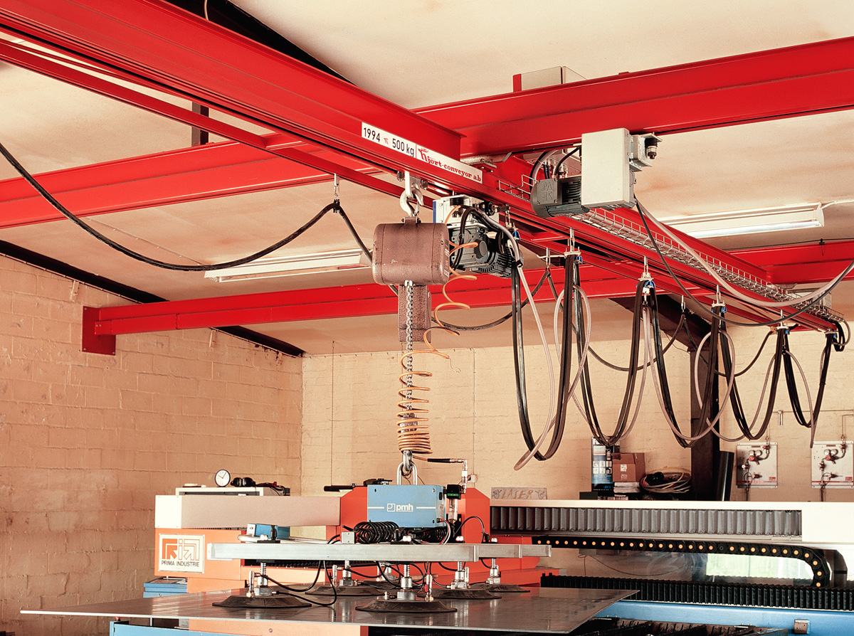 Hjort conveyor crane systems are based on a C-shaped steel track. Travelling tracks are available for hand forwarding or for electric motor drive and can be combined with the 500 Series manual track system.